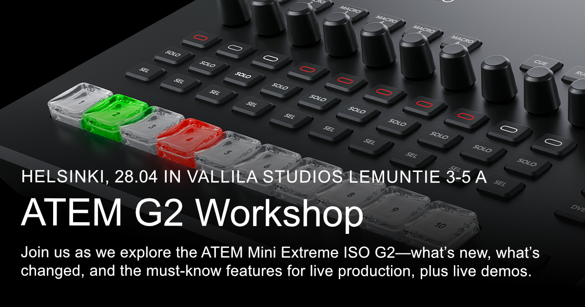 Mediatrade will be hosting a workshop surrounding the upgraded Atem G2. The event will be held on the 28th of April 2026 between 15:00-17:00 at the Vallila Studios in Lemuntie 3-5, 00510 Helsinki.