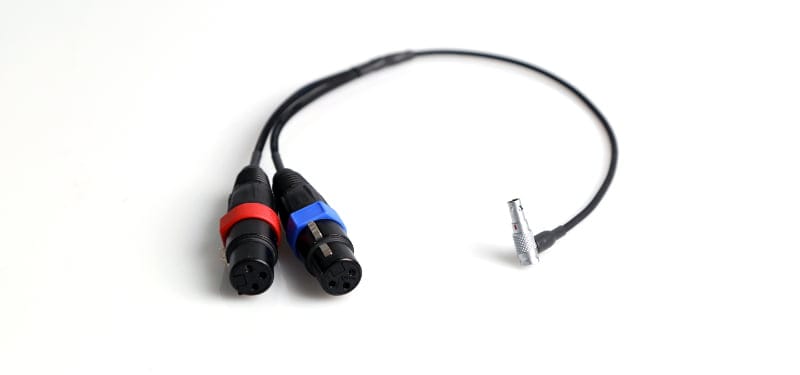 Balenced stereo Input cable for Ariflex Alexa Mini. (2) XLR3F connectors terminating in a Right-Angle mini 5-pin Lemo connector. 17 in. with 4 in. fan