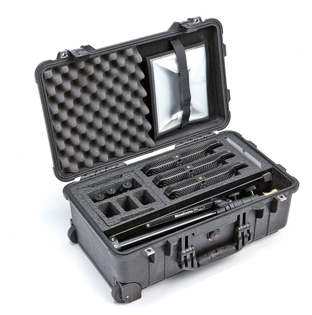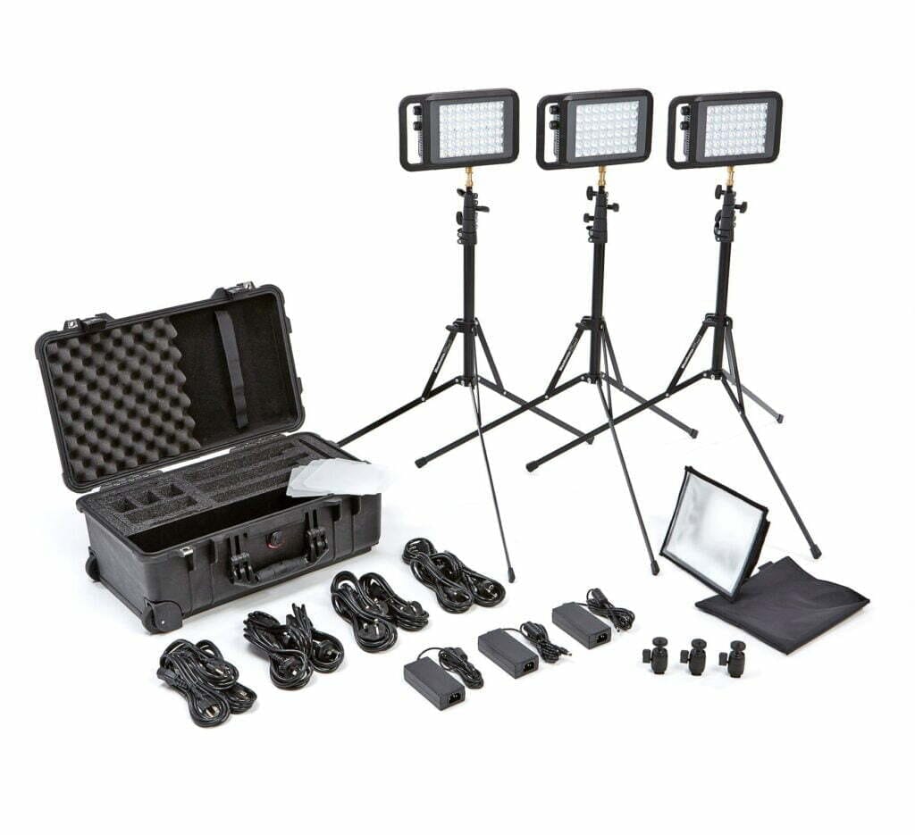 Litepanels Lykos+ BiColor Flight Kit with 3 Litepanels Lykos+ BiColor, 3 Stands, 1 Soft Box, 3 NP 976 Batteries and 3 Single Chargers with EU power adapter.