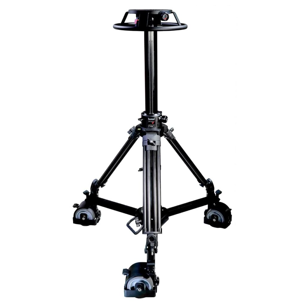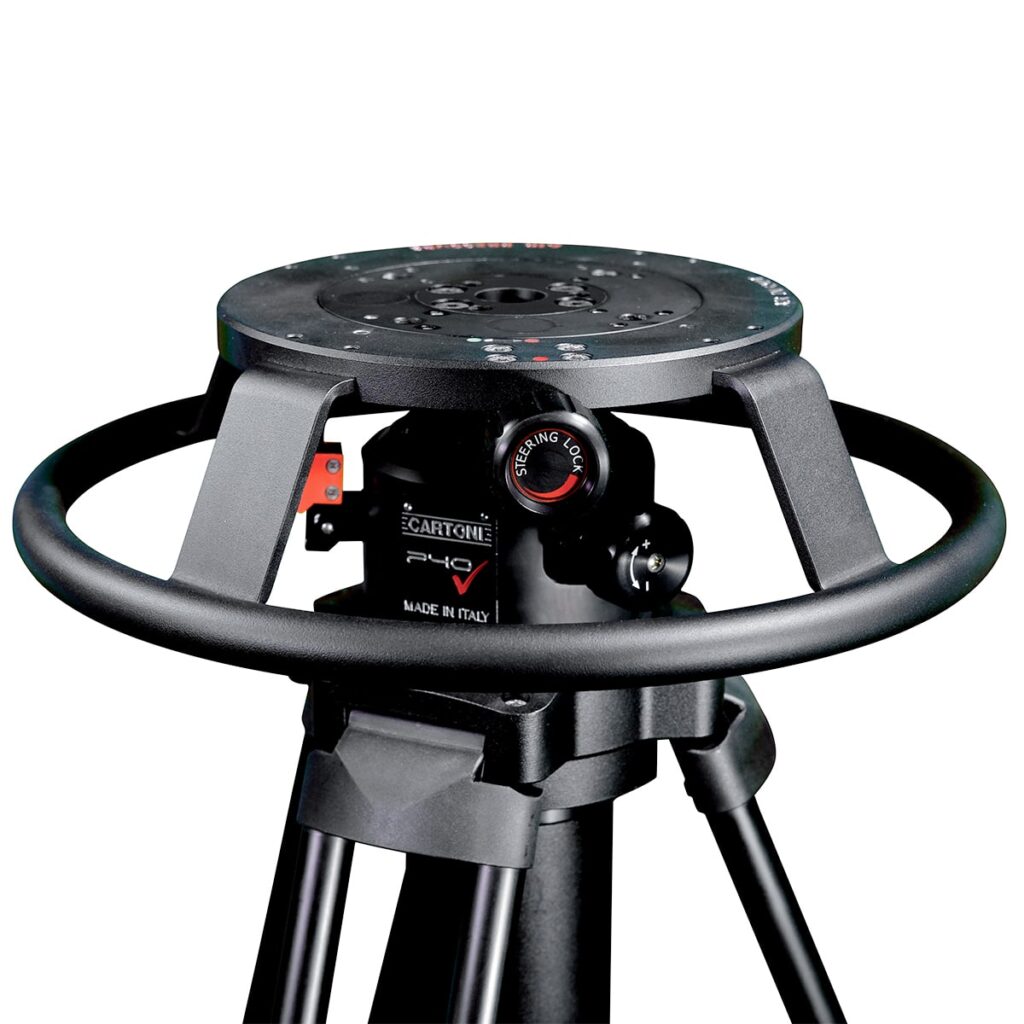 The P40 HP can be mounted on tracks of 620 mm pace with a skating wheel group. The air pressure inside the column can be set manually and adjusted to suit the exact weight of the head and camera configuration. It can be set up or disassembled fast and easy, the steering wheel has a fast lock attachment and the platform interfaces with a variety of optional head adapters.