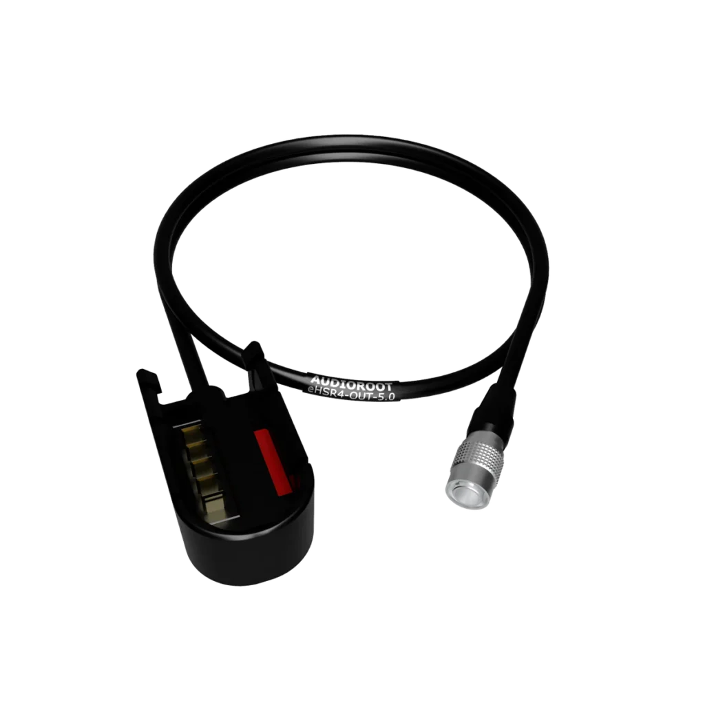 The eHRS4-OUT-5.0 is a rugged output cable that connects directly to an Audioroot smart battery using a secure battery cup, and provides power through a Hirose 4-pin male connector. It integrates a 5.0A active current limiting circuit, making it ideal for safely powering modern devices and protecting power distribution setups.