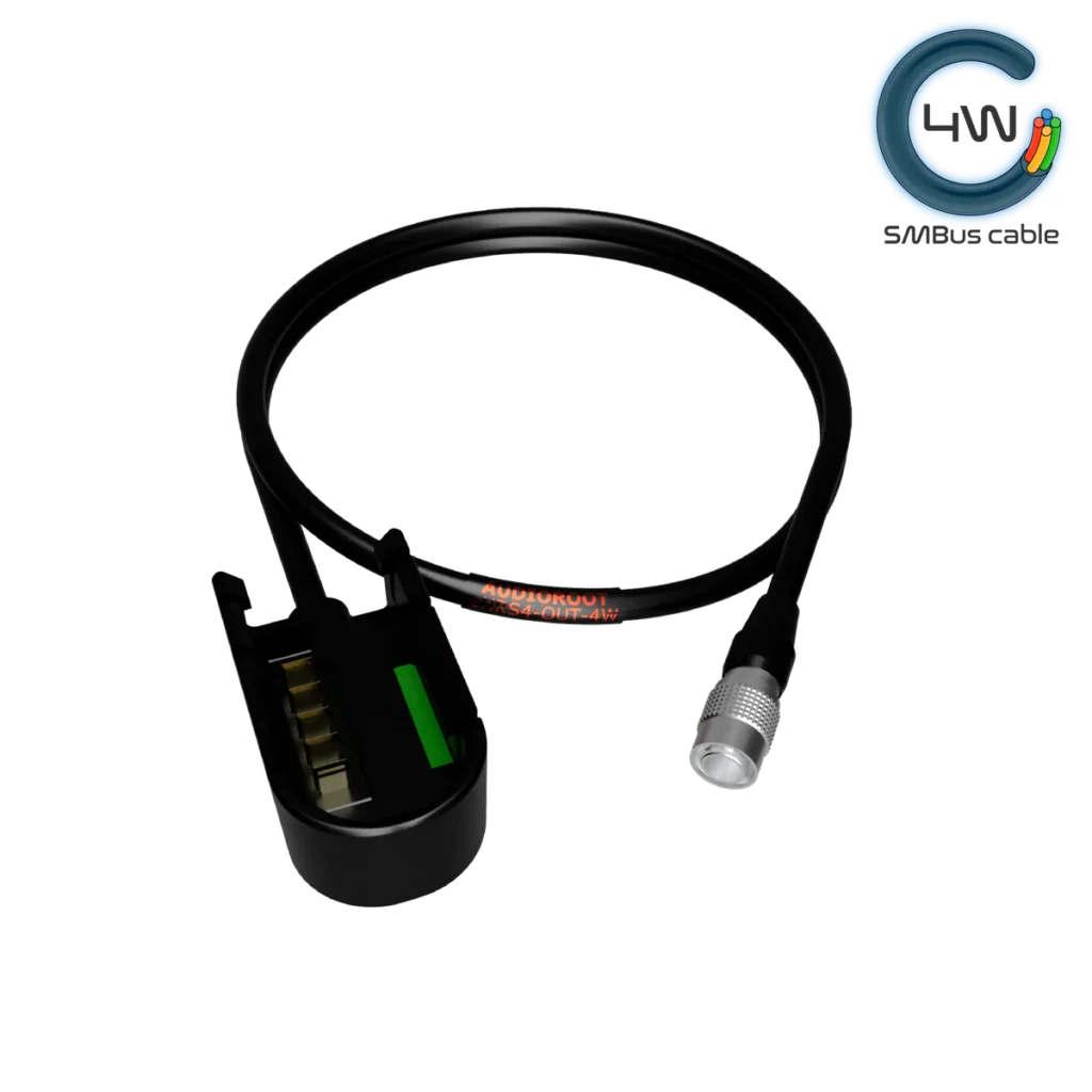 The eHRS4-OUT-4W cable powers devices via a Hirose 4-pin (HRS4) connector and features the Audioroot battery cup to securely interface with smart batteries.