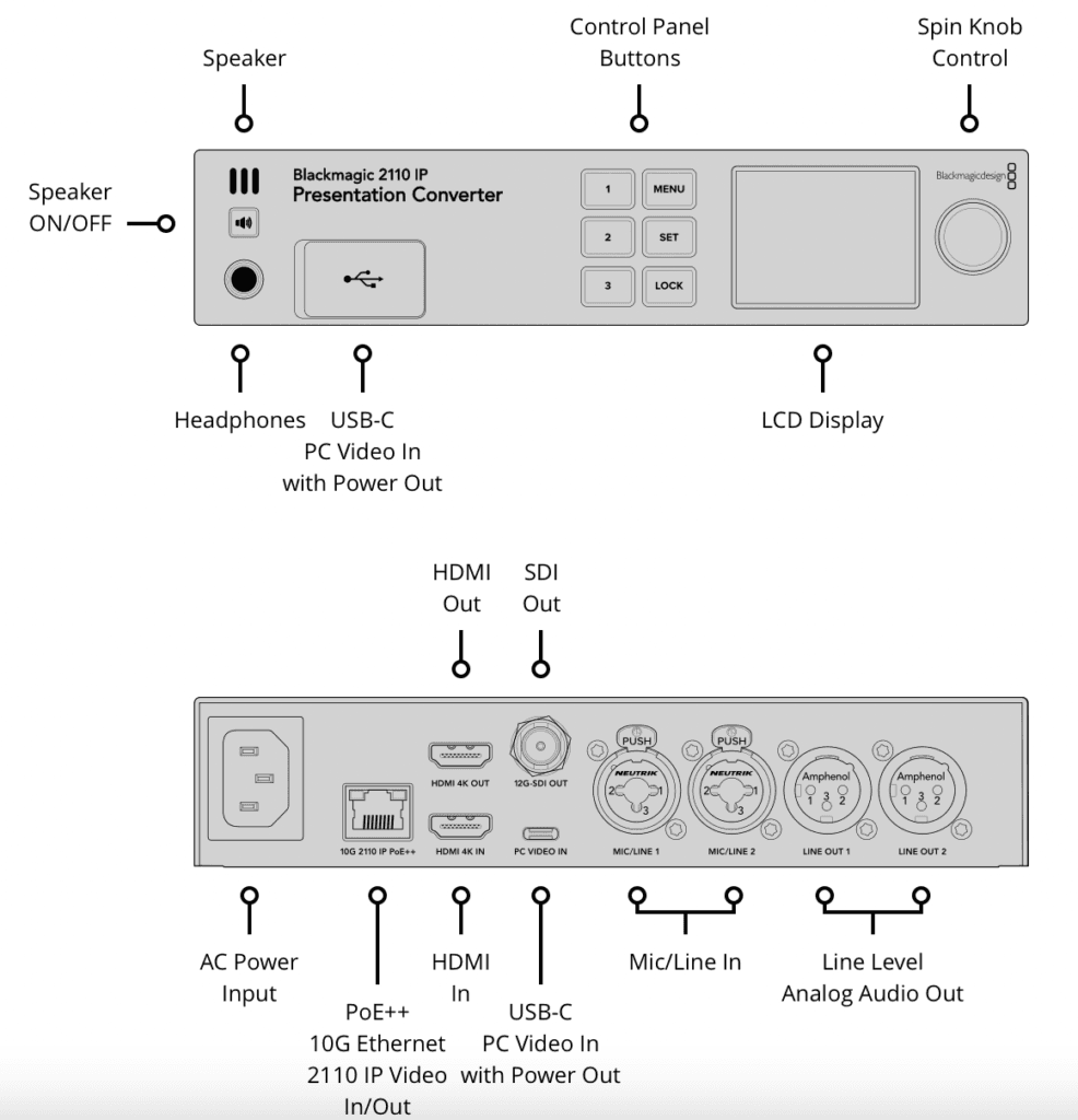 Blackmagic 2110 IP Presentation Converter is designed for speaker podiums with connections for laptops, projectors and microphones all in the one converter.