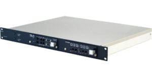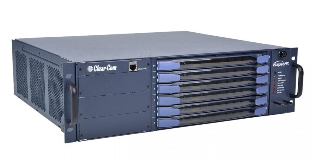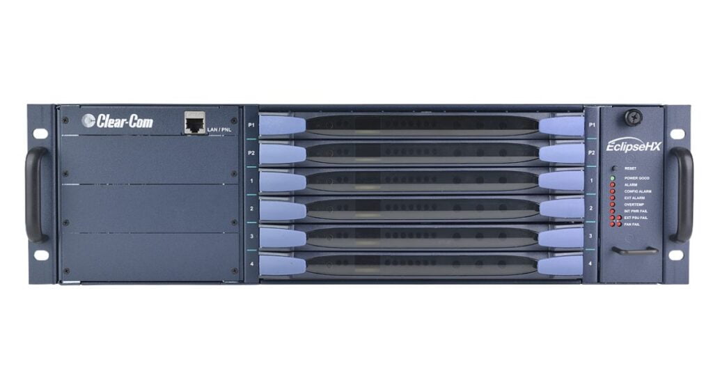 The Eclipse HX-Delta is a three rack unit (3RU) matrix intercom system frame with slots for two CPU cards, four I/O interface cards and three interface modules. Two external power supplies are provided. RJ45 and fiber connectors are located on the rear of the chassis, connecting the CPU and interface cards to intercom devices and media, such as user keypanels, interfaces, 4-wire audio equipment, wireless equipment