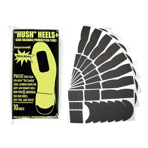 Hush Heels are precut adhesive backed foam pads for the noisy “on-camera” shoes and ae made to suppress heel noises on set. These pads come in an assortment of shaped for both men and women’s heels, they are also great for quieting on-camera props such as dishes, cups, etc.