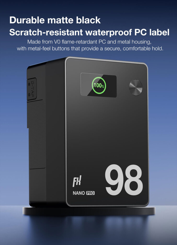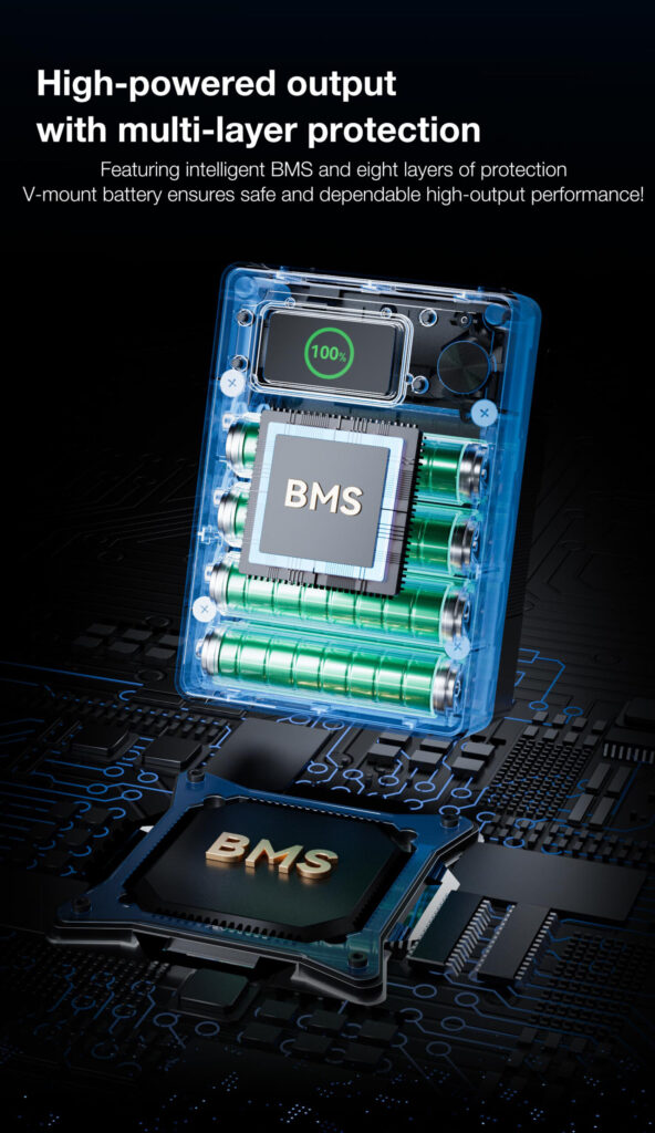 This ultra-compact V-mount battery is engineered for maximum energy and volume efficiency, utilizing high-rate lithium cells with a 98Wh capacity that supports up to 13A high-current discharge and delivers a peak output power of 156W. It features a smart LCD screen with an intelligent display that provides real-time information on battery capacity, input/output voltage, power, charge/discharge time, cycle count, and internal temperature, and it also supports communication with cameras to display battery status directly on-screen. An integrated intelligent BMS offers comprehensive protection against overvoltage, overcurrent, over-temperature, overcharge, over-discharge, and overload. The battery includes a USB-C PD100W input/output port for ultra-fast charging and high-power discharge, supported by a smart thermal management system to ensure stable and safe 100W output. Additional outputs include two USB-C 18W ports for powering multiple devices simultaneously, a USB-A fast charging port for broad compatibility, and two D-Tap outputs supporting up to 13A combined output to drive professional-grade equipment. All output ports can operate simultaneously without interference. The V-mount plate is designed with both 1/4 and 3/8 threaded holes for flexible mounting and rigging of professional accessories, and the D-Tap and USB ports are equipped with dust caps for enhanced durability and field protection. The housing is constructed from a combination of metal and V0 flame-retardant plastic, featuring a metal-like finish button design that enhances both safety and handheld comfort. Fully compatible with professional V-mount chargers and USB-C charging options, this battery is ideal for a wide range of applications — from smartphones and laptops to video lights and cinema cameras — making it a versatile power solution for both consumer and professional users.
