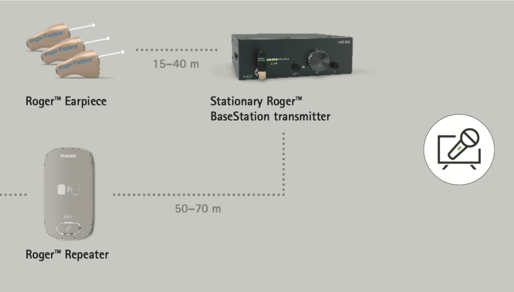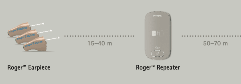 Phonak Roger Repeater expands the range of Phonak’s Roger Earpiece by approximately 50m per repeater. The Roger communication system, renowned for being virtually invisible and delivering great sound quality with plug-and-play setup, now also offers an unlimited range thanks to the Roger Repeater.